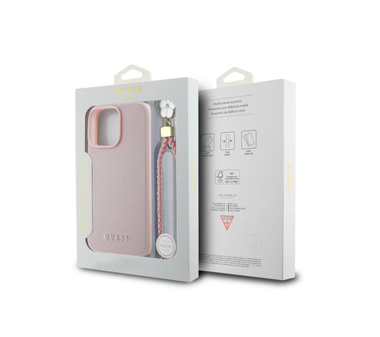 iPhone 16 Pro Max - Funda Guess - Grained - MagSafe - Con Strap Dije Flor - Rosa - Guess