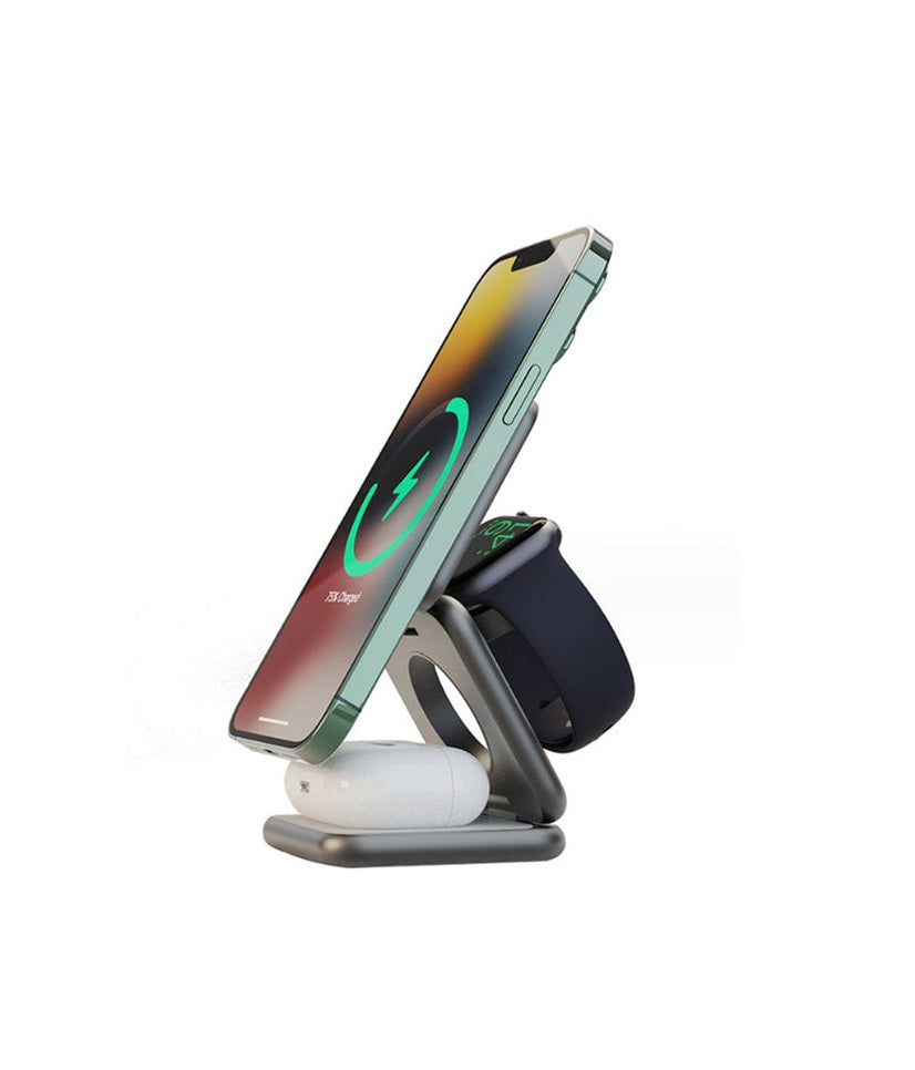 Trio es una elegante y práctica estación de carga tres en uno que carga sin esfuerzo tu iPhone, Apple Watch y AirPods simultáneamente, agilizando tu experiencia de carga.