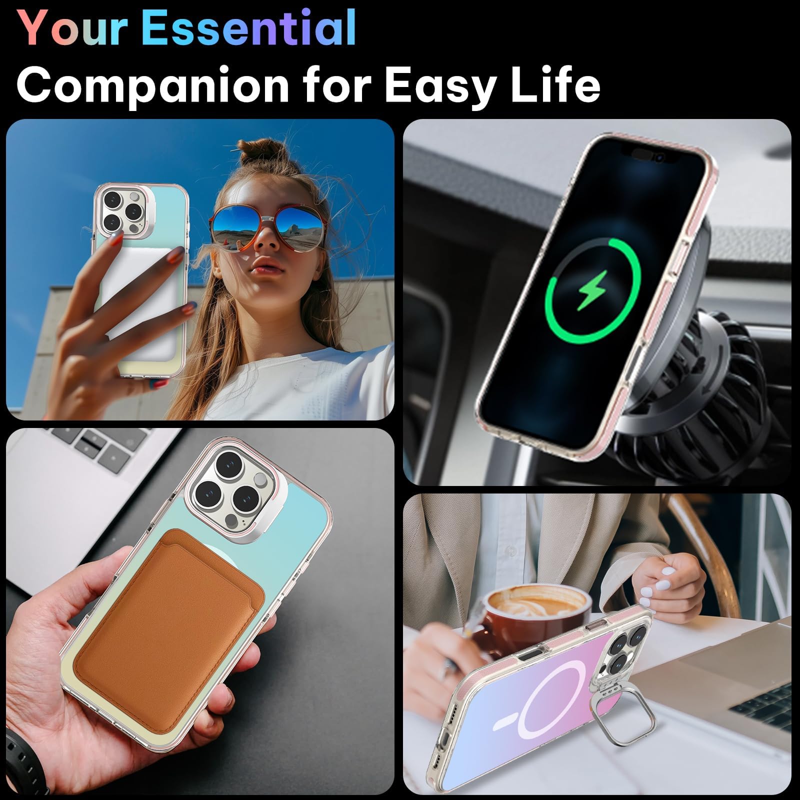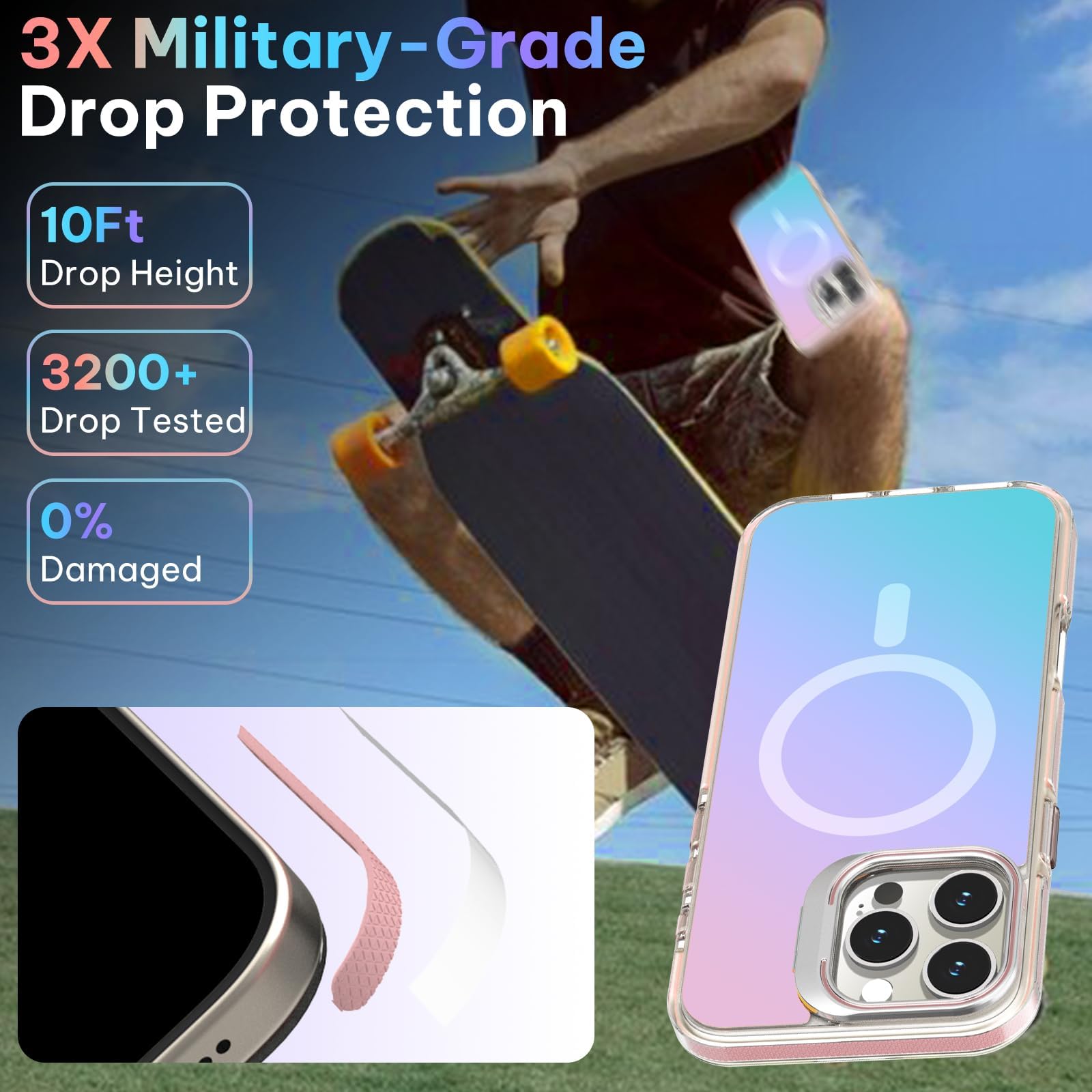 - Carga inalámbrica y estética impresionante: Totalmente compatible con cargadores inalámbricos, sin necesidad de quitar el estuche. Cuenta con un deslumbrante acabado electrochapado en arco iris de 360° que cambia de color con la luz, combinando estilo con funcionalidad. (Consejo: el color de la funda del teléfono puede ser diferente bajo diferentes luces y ángulos)