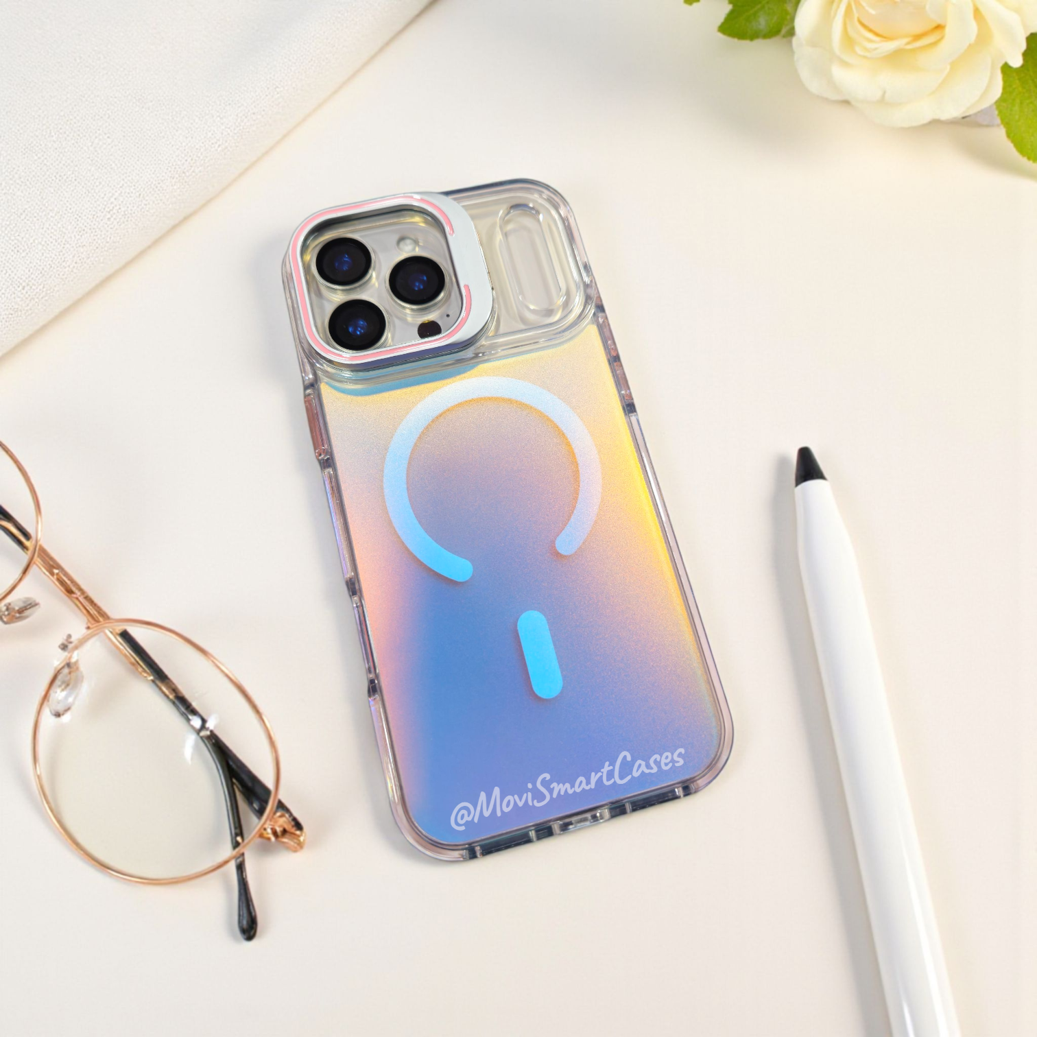 "Protege tu iPhone 17 Pro Max con estilo con esta funda iridiscente en tonos rosas. Hecha de TPU silicona, cuenta con tecnología MagSafe y soporte para las cámaras. ¡No te preocupes por golpes o rayones, tu teléfono estará a salvo con esta funda elegante y funcional!"